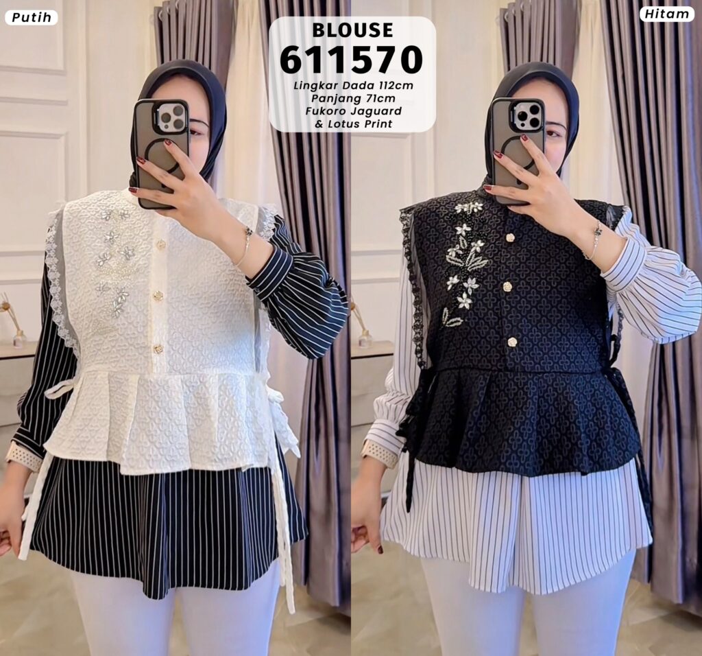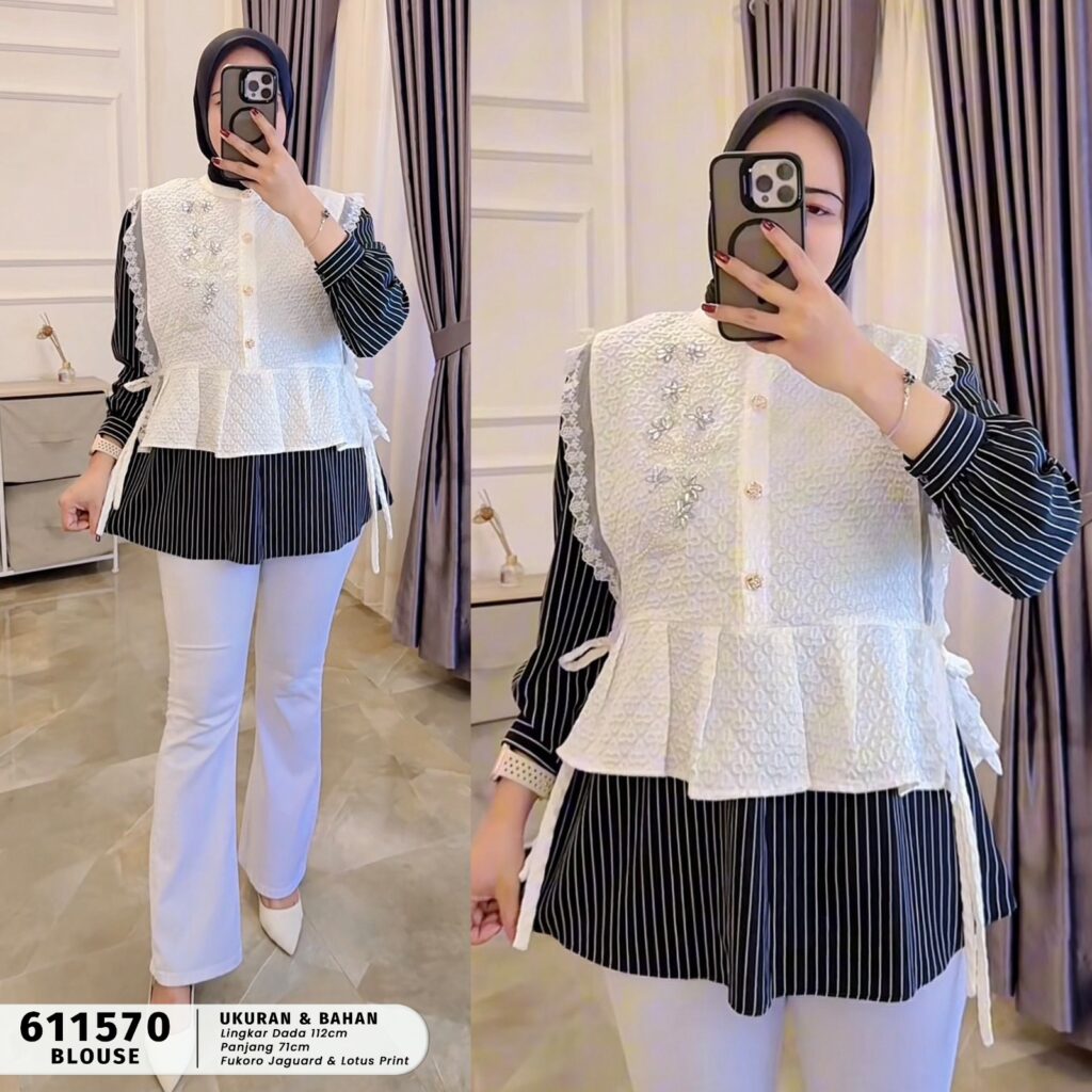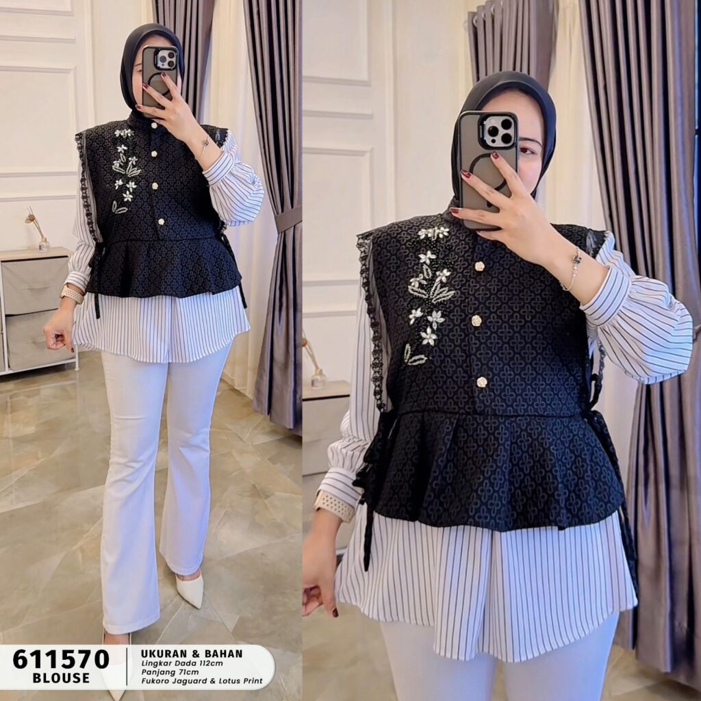 | Model | Blouse kombinasi vest bermotif dengan inner garis |